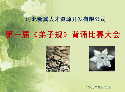 3月6日,河北新冀人才資源開發有限公司舉辦了第一屆《弟子規》背誦比賽大會,并取得了圓滿成功。本次比賽活動由新冀公司發起,以學《弟子規》為主要內容,行《弟子規》為目的,并最終實現將《弟子規》精神作為公司文化核心。